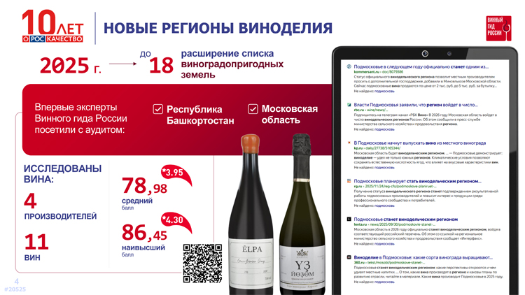 В Подмосковье и Республике Башкортостан готовятся получить официальный статус виноградопригодных земель. Скоро мы перестанем удивляться таким фактам, но пока они воспринимаются как сенсация. Специалисты Роскачества посетили винодельческие предприятия этих регионов. Были исследованы 11 образцов от четырех производителей. Средняя оценка – до 79 баллов, а одно вино получило 86,45 баллов. Максим Протасов сообщил еще одну новость: впереди у нас знакомство с винами Мордовии.